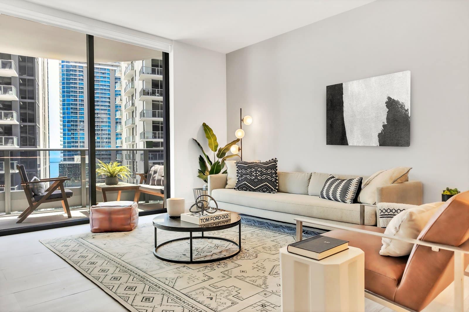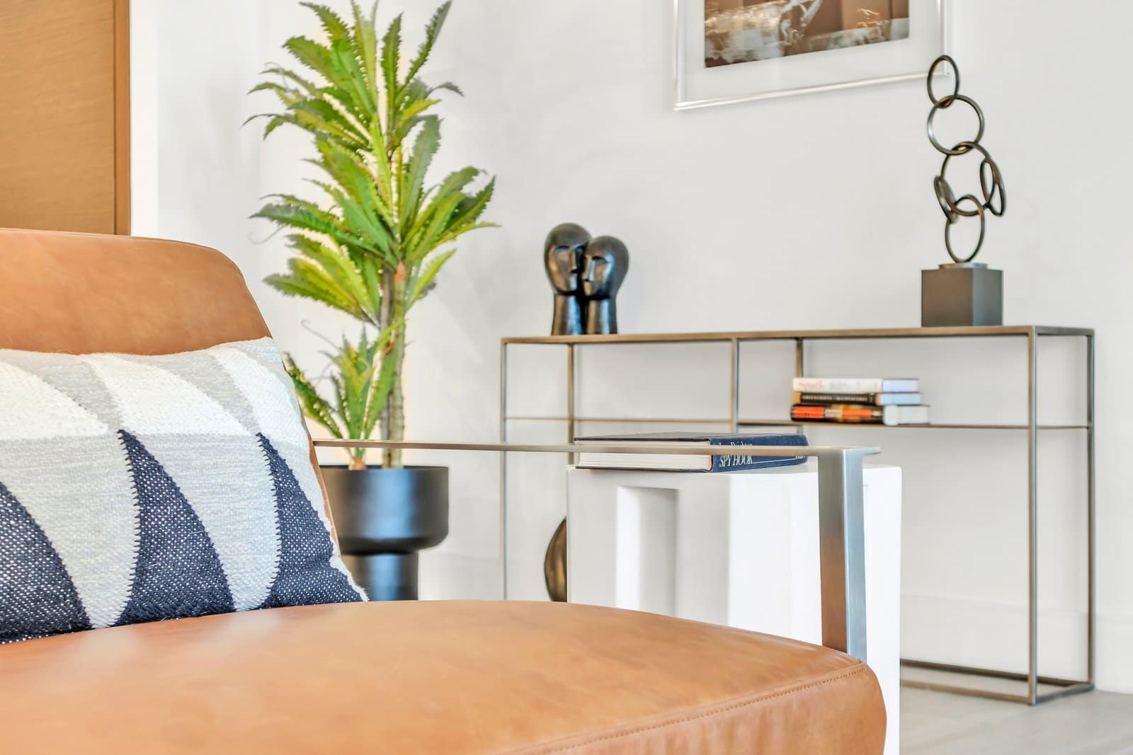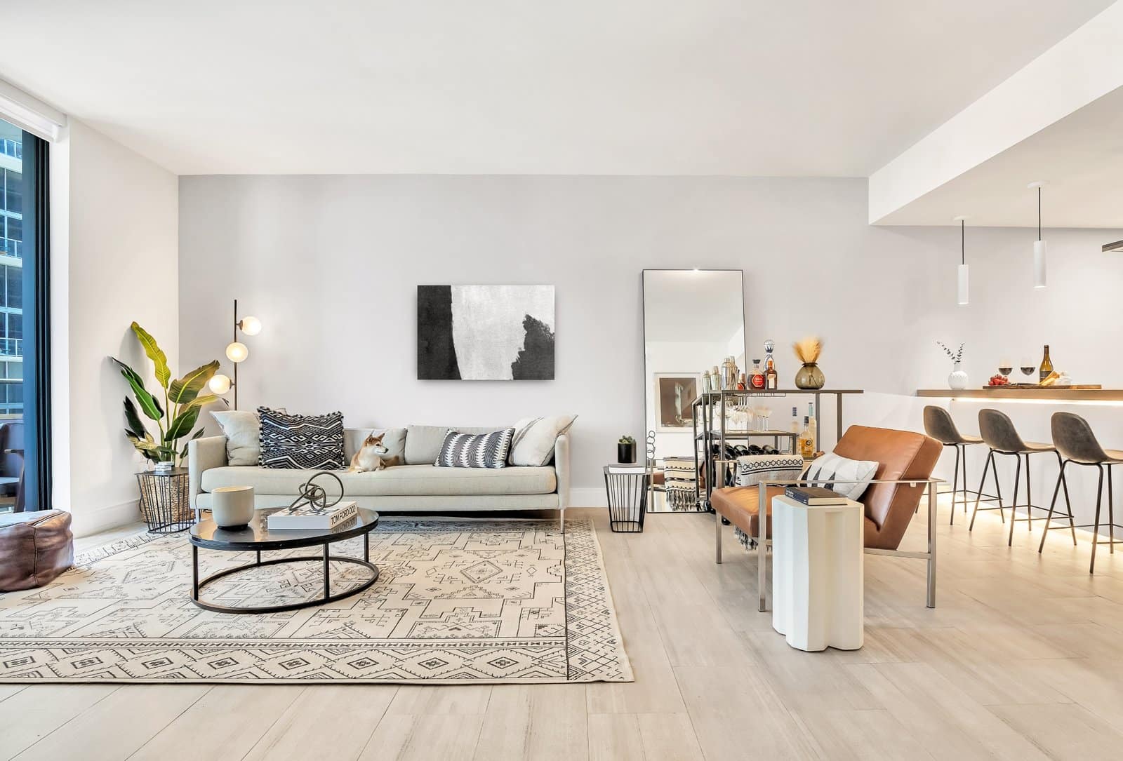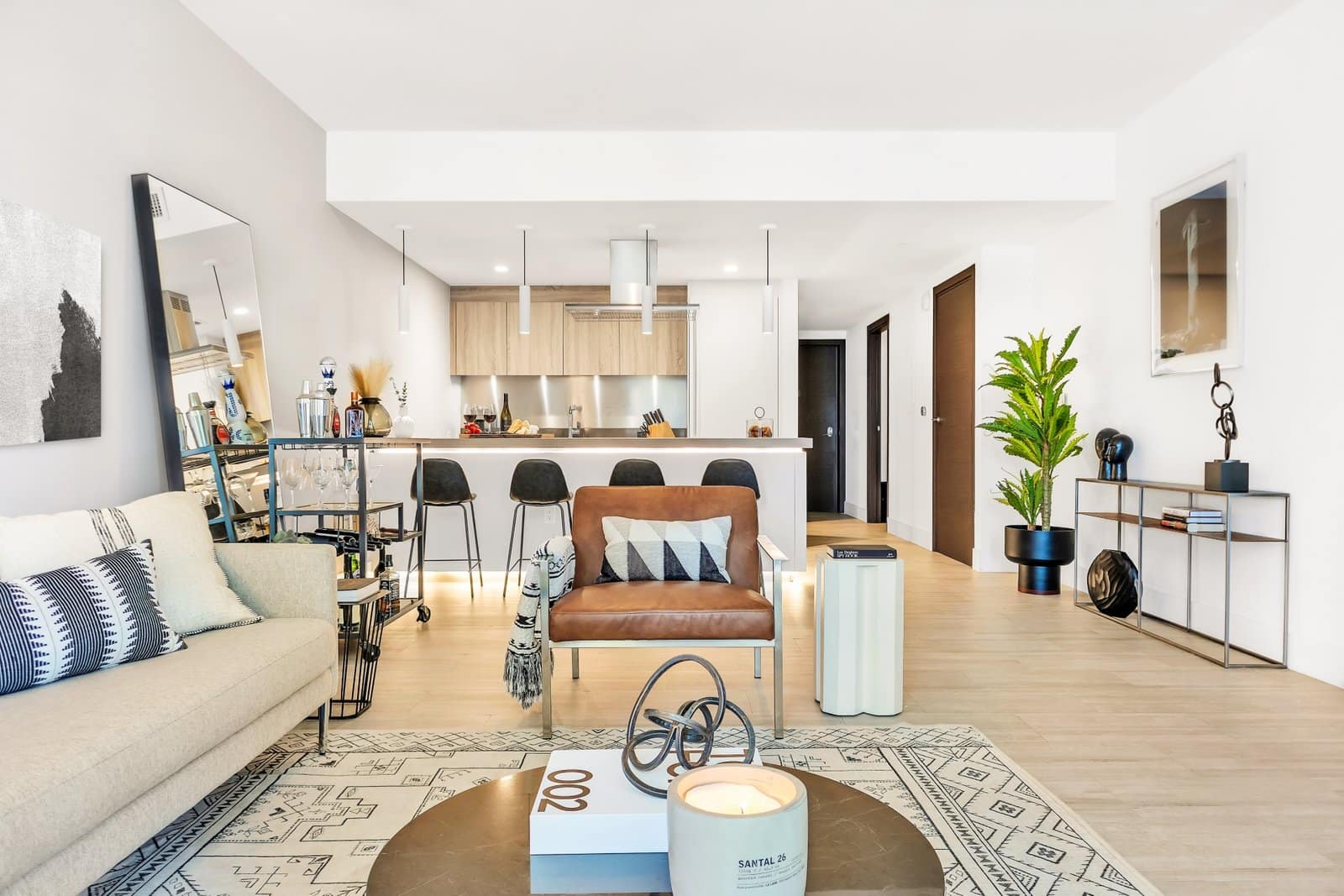The focus of this project was the living room and bedroom, both redesigned to reflect a masculine, modern, and comfortable aesthetic. The living room was updated with a sleek gray sofa, paired with a simple coffee table and a brown leather accent chair that adds warmth and contrast. The result is a space that feels contemporary yet inviting.