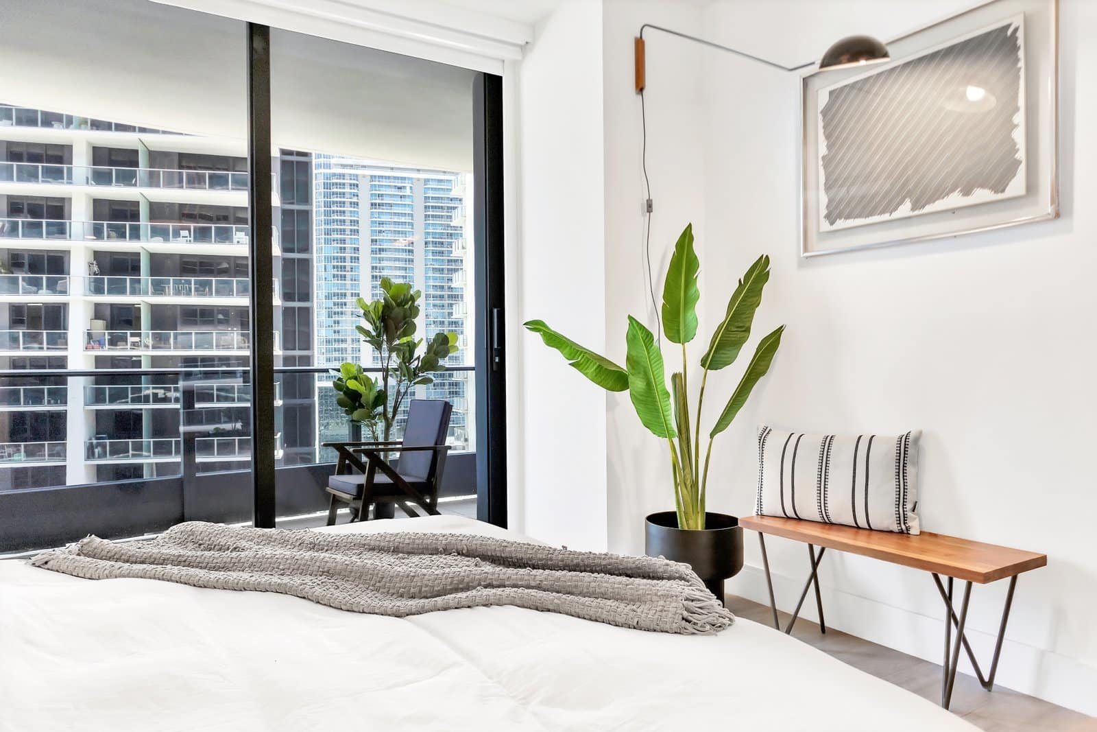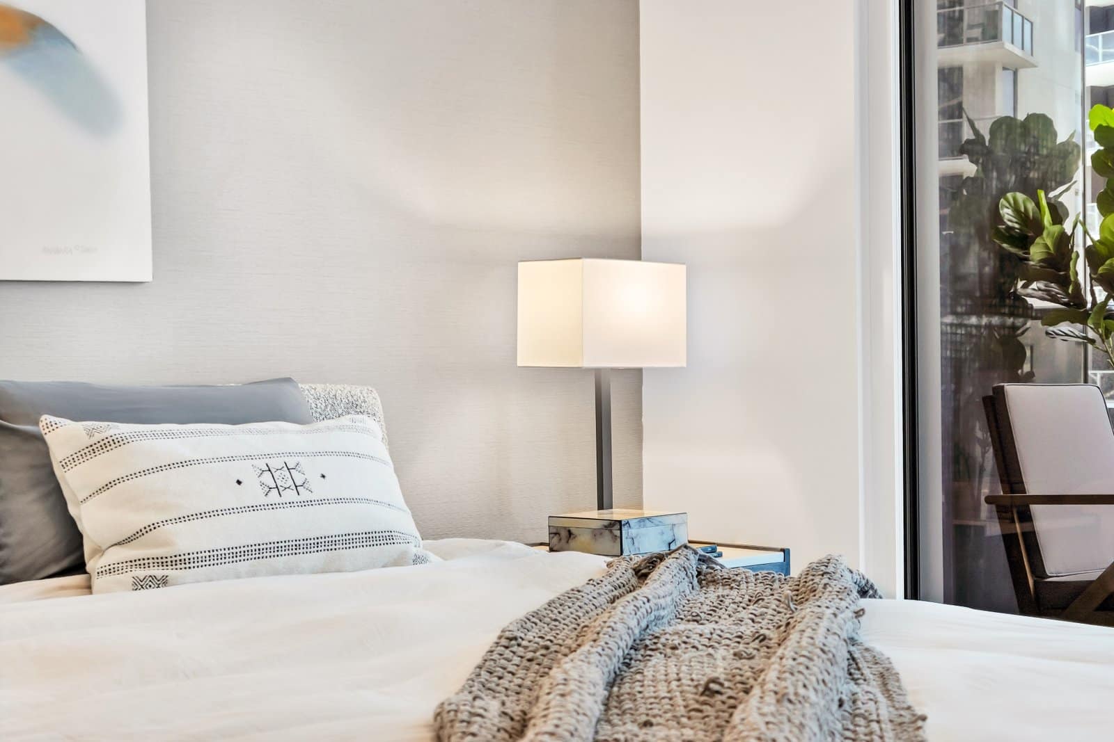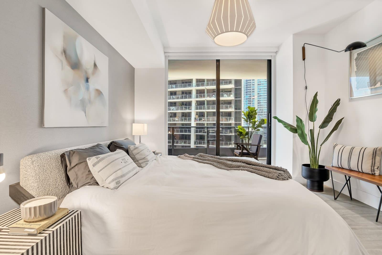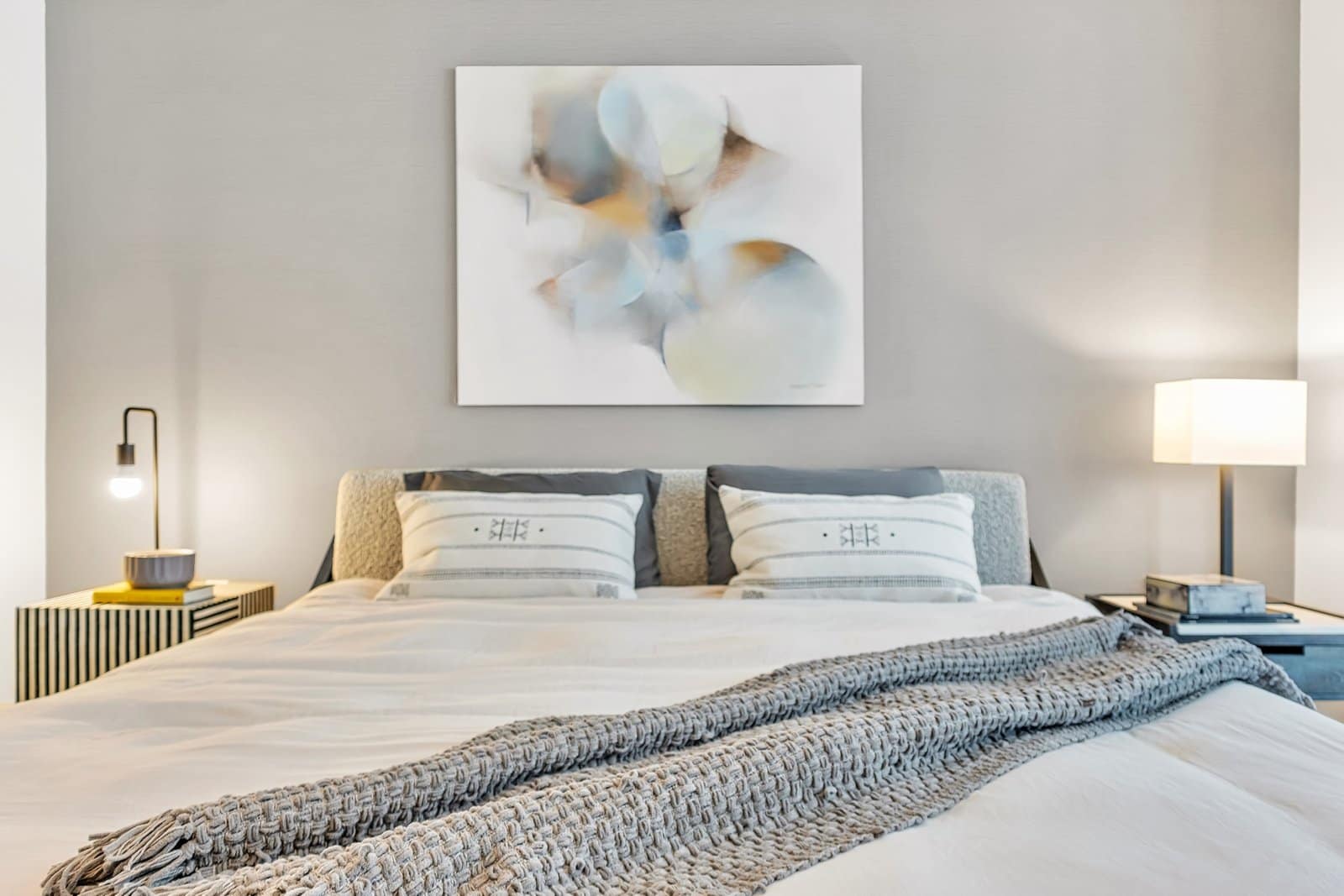 In the bedroom, a wooden bed by Jannis Ellenberger became the centerpiece. Its clean lines and unexpected details brought character, while layered neutral bedding and textured pillows added depth and comfort.
