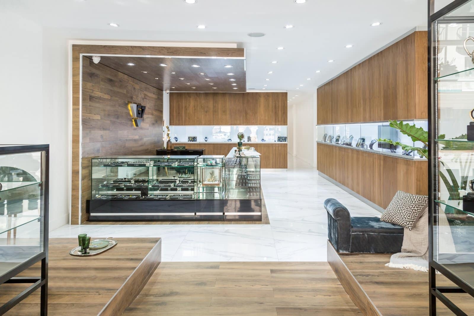 Lighting was central to the design. A mix of recessed and LED fixtures highlights key displays, while natural light brightens the space and adds to its inviting atmosphere. The overall look blends modern elegance with refined simplicity, creating a store that enhances both the shopping experience and the presentation of the jewelry.