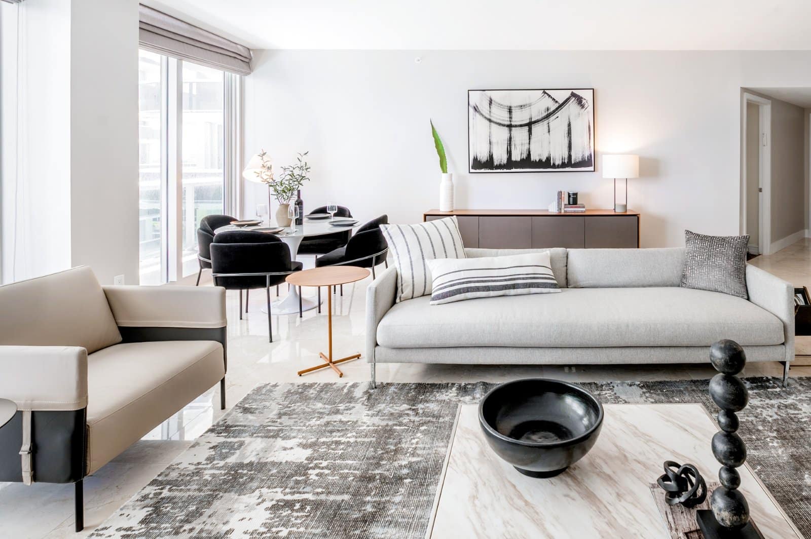 A neutral palette sets the tone, layered with darker accents and warm wood textures that bring depth and personality. Durable, refined furniture was selected to offer both comfort and longevity — pieces that work as well for quiet evenings alone as for hosting friends during getaways.